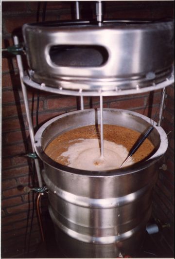Nach dem Anmaischen wird der Sud in verschiedenen Rasten erhitzt. Eiweißrast, Maltoserast, Endverzuckerung. Hier zu sehen das aufheizen zur Eiweißrast mit Schaumbildung